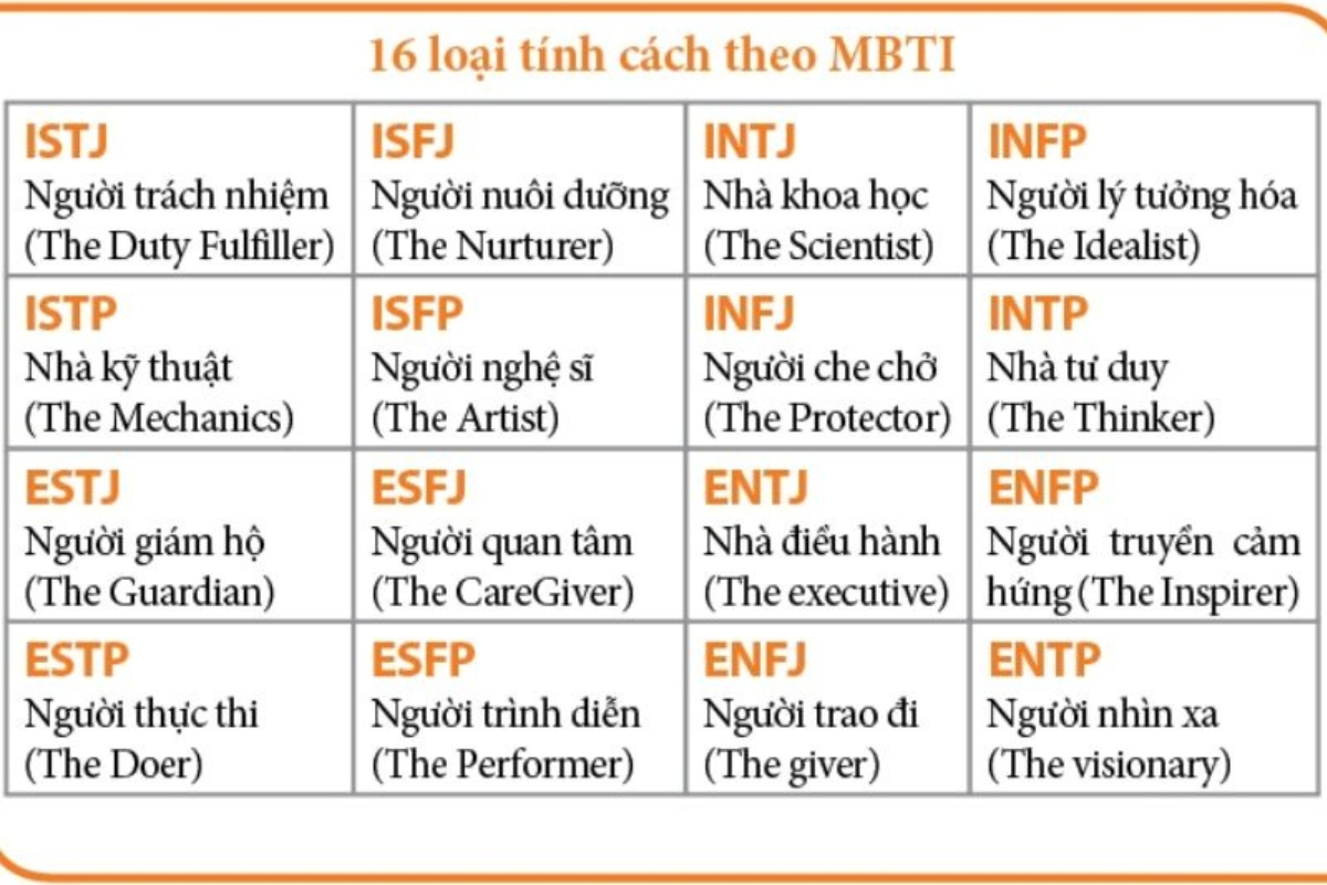 Từ đó hình thành 16 nhóm tính cách MBTI (ví dụ: ISTJ, ENFP, INTJ…).